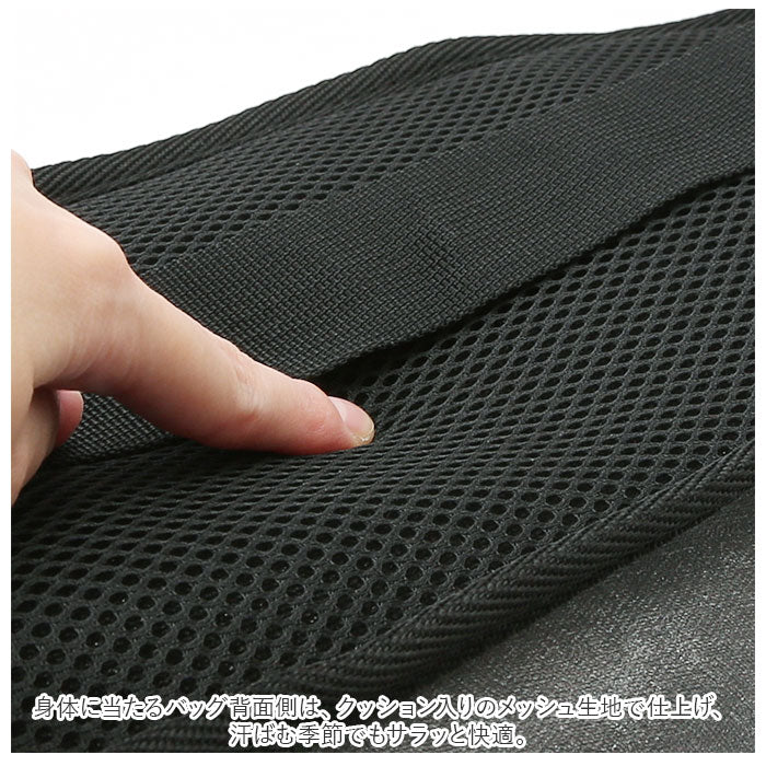 ・身体に当たるバッグ背面側は、クッション入りのメッシュ生地で仕上げ、汗ばむ季節でもサラッと快適。