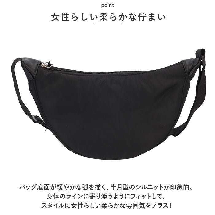 ・バッグ底面が緩やかな弧を描く、半月型のシルエットが印象的。身体のラインに寄り添うようにフィットして、スタイルに女性らしい柔らかな雰囲気をプラス!