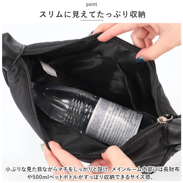 ・小ぶりな見た目ながらマチをしっかりと設け、メインルーム内部には長財布や500mlペットボトルがすっぽり収納できるサイズ感。
