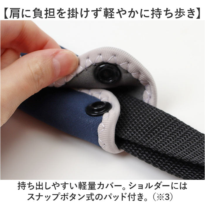 ・持ち出しやすい軽量カバー。ショルダーにはスナップボタン式のパッド付き。