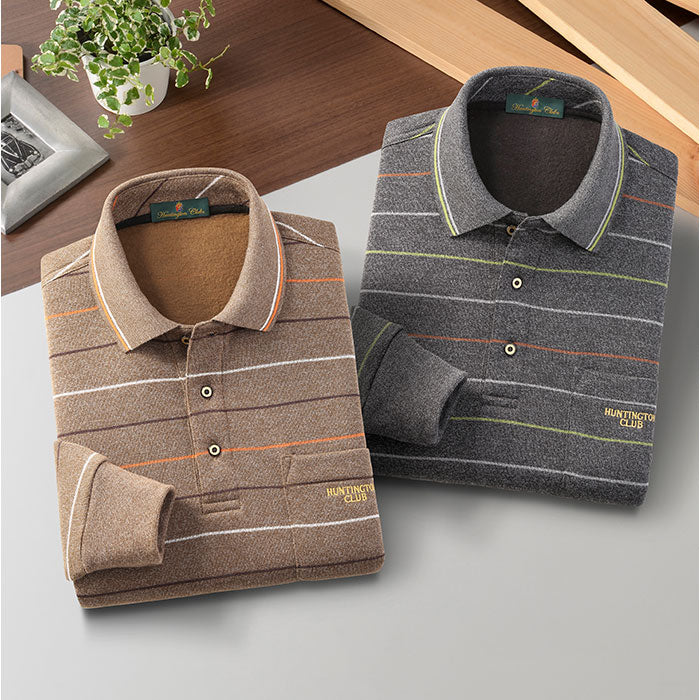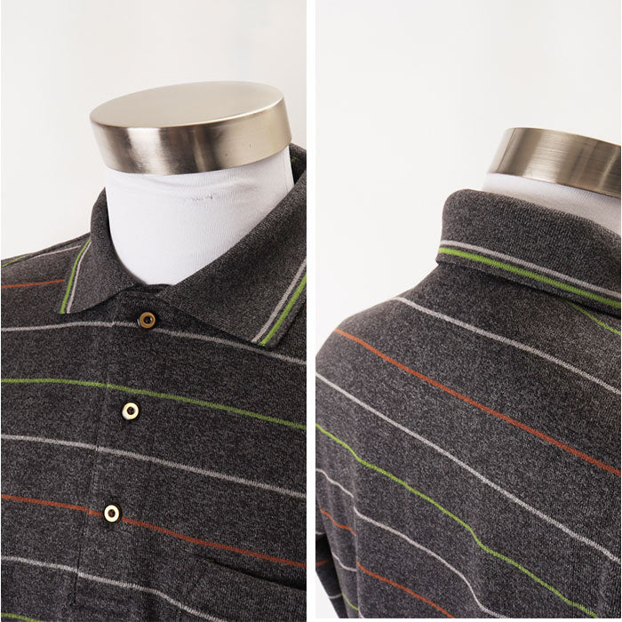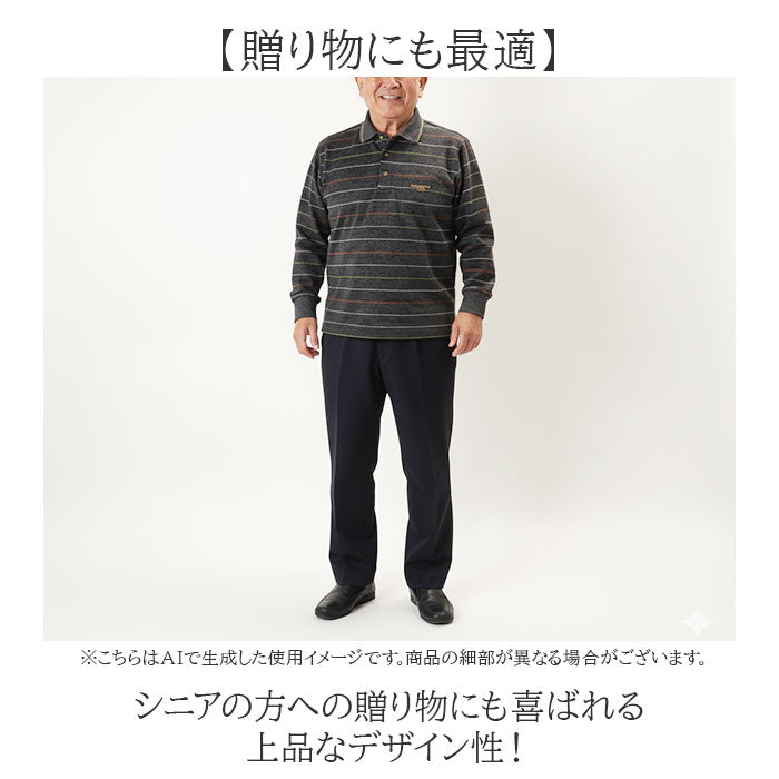 ・落ち着いたボーダー柄で品よく決まる長袖ポロシャツ。