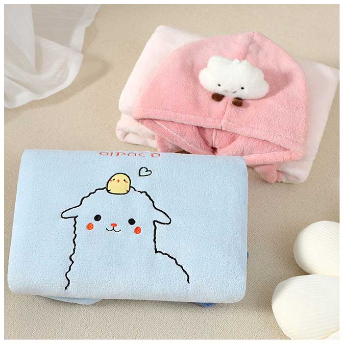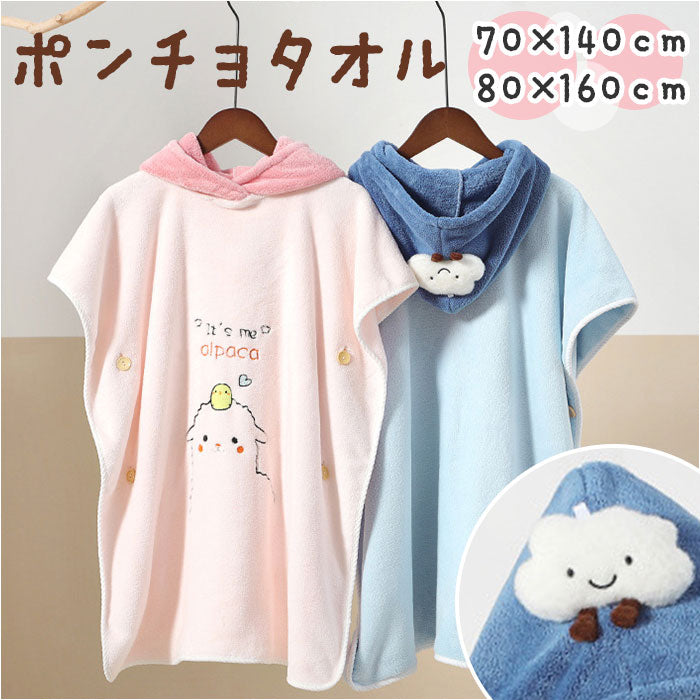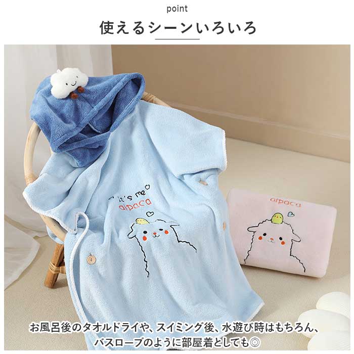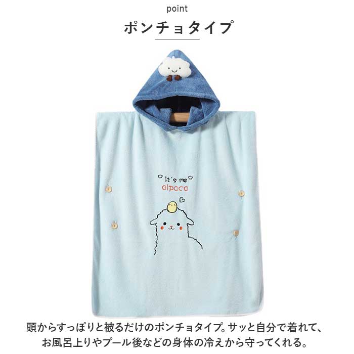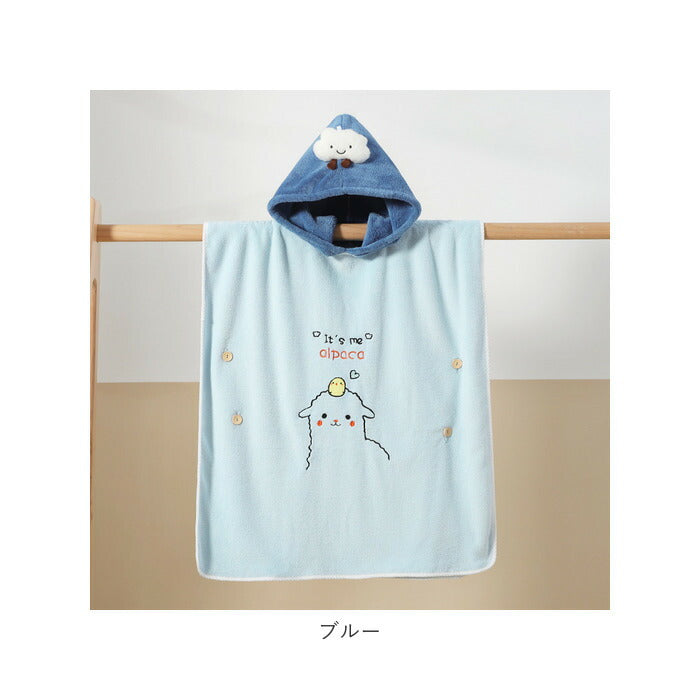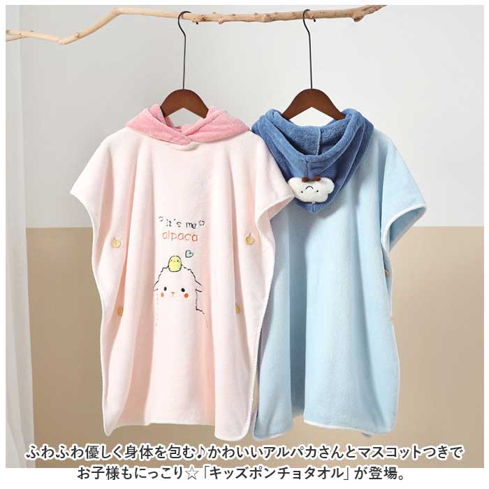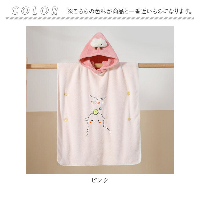 ・ふわふわ優しく身体を包む♪かわいいアルパカさんとマスコットつきでお子様もにっこり☆「キッズポンチョタオル」が登場。