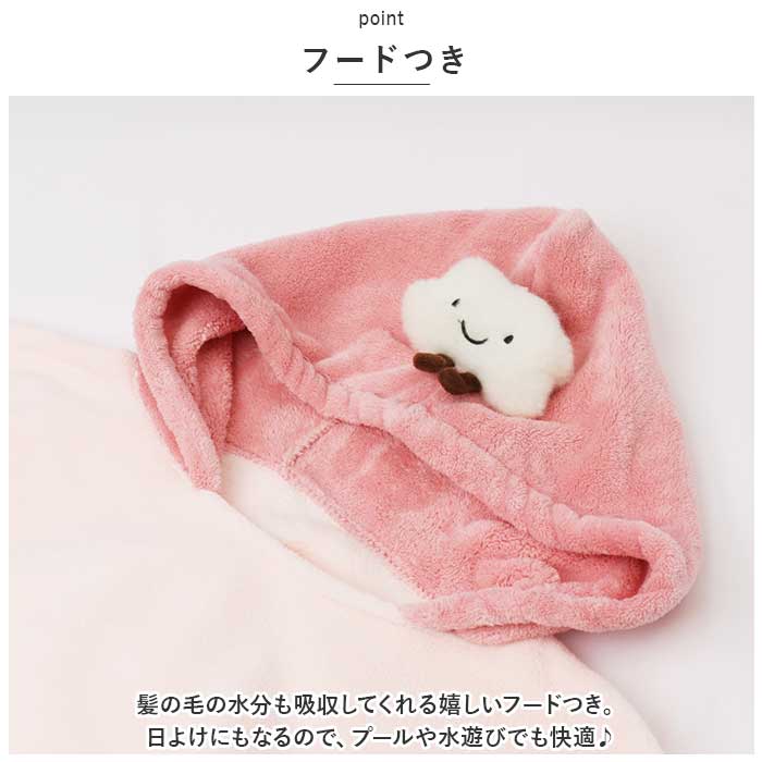 ・髪の毛の水分も吸収してくれる嬉しいフードつき。日よけにもなるので、プールや水遊びでも快適♪