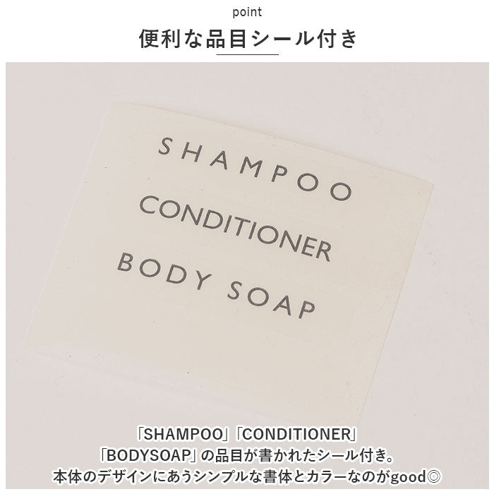 「SHAMPOO」「CONDITIONER」「BODYSOAP」の品目が書かれたシール付き。本体のデザインにあうシンプルな書体とカラーなのがgood◎