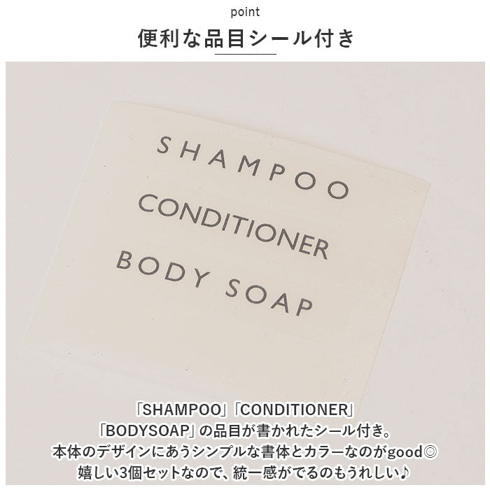 「SHAMPOO」「CONDITIONER」「BODYSOAP」の品目が書かれたシール付き。本体のデザインにあうシンプルな書体とカラーなのがgood◎
