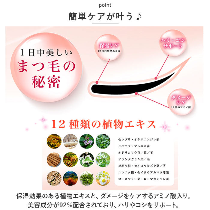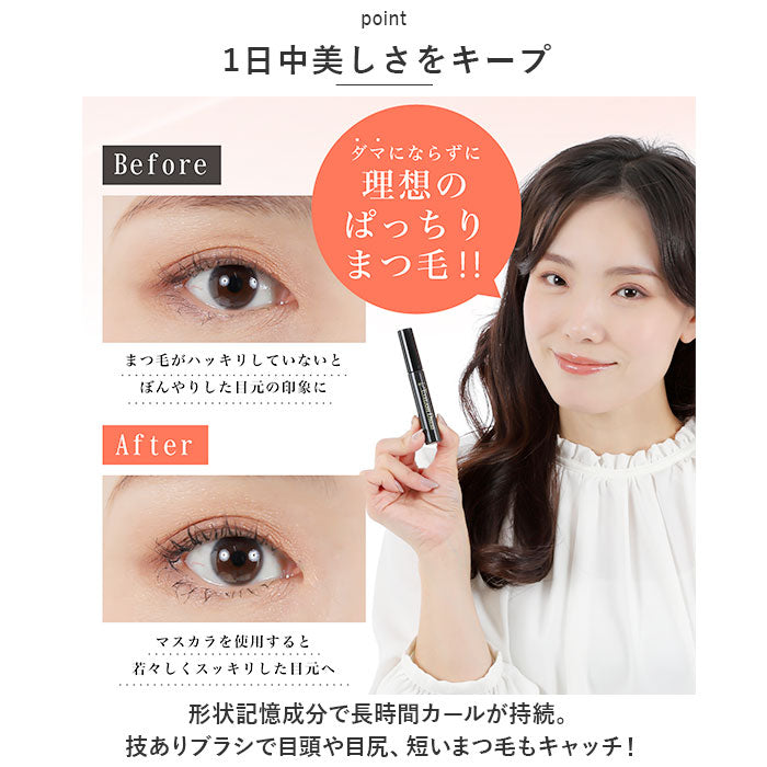 ・形状記憶成分で長時間カールが持続。技ありブラシで目頭や目尻、短いまつ毛もキャッチ!ダマになりにくく、理想のぱっちりまつ毛に。