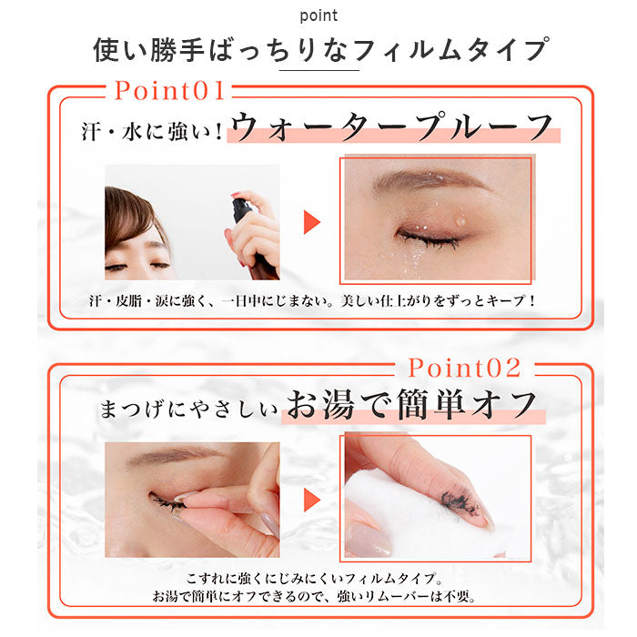 ・汗や水に強いウォータープルーフ仕様!にじまず美しい仕上がりをキープしつつ、お湯のみで簡単オフできるからリムーバーも不要。