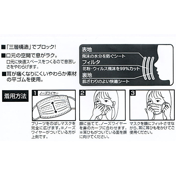 ・表地(飛沫の水分を防ぐシート)、フィルター(花粉、ウィルス飛沫を99%カット)、裏地(肌ざわりの良い快適シート)。