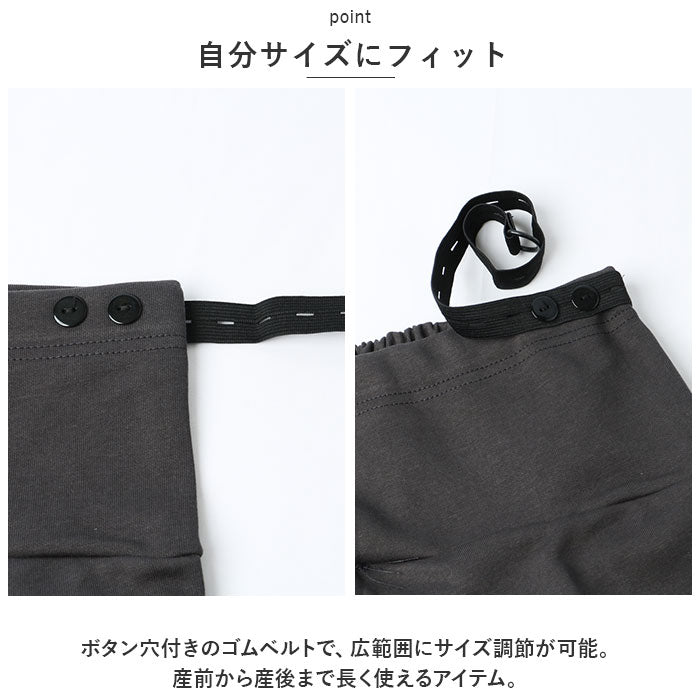 ・ボタン穴付きのゴムベルトで、広範囲にサイズ調節が可能。産前から産後まで長く使えるアイテム。