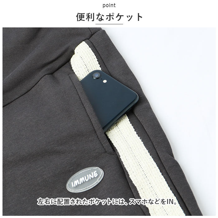 ・リラックス感たっぷりでお出かけにはもちろん、部屋着としてもおすすめ。柔らかな素材に、サイドラインやロゴタグをプラス。