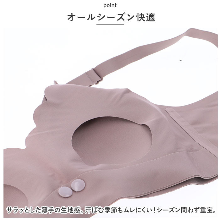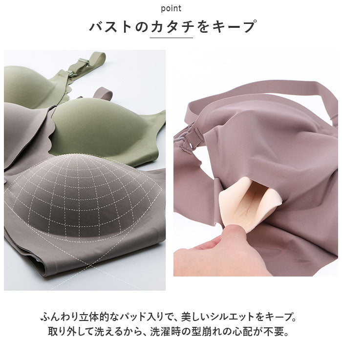 ・窮屈感が苦手な方にぴったり。締めつけ感のないノンワイヤー仕様ながら、バストまわりを優しく包み込んでくれる♪負担をかけない軽量設計&ソフトな質感。