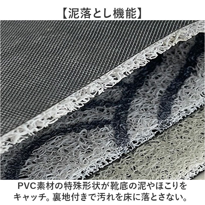 ・PVC素材の特殊形状が靴底の泥やほこりをキャッチ。裏地付きで汚れを床に落とさない。