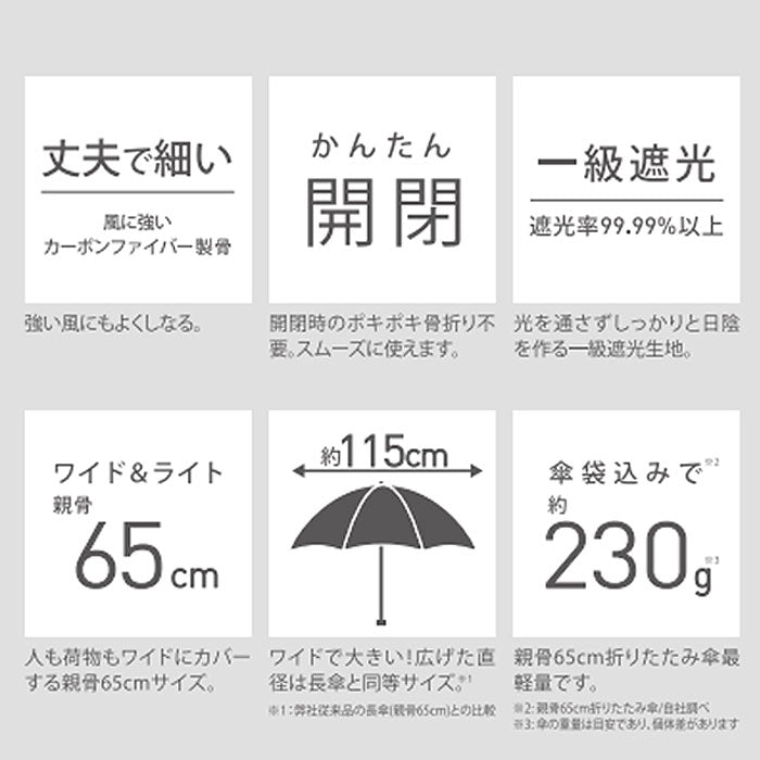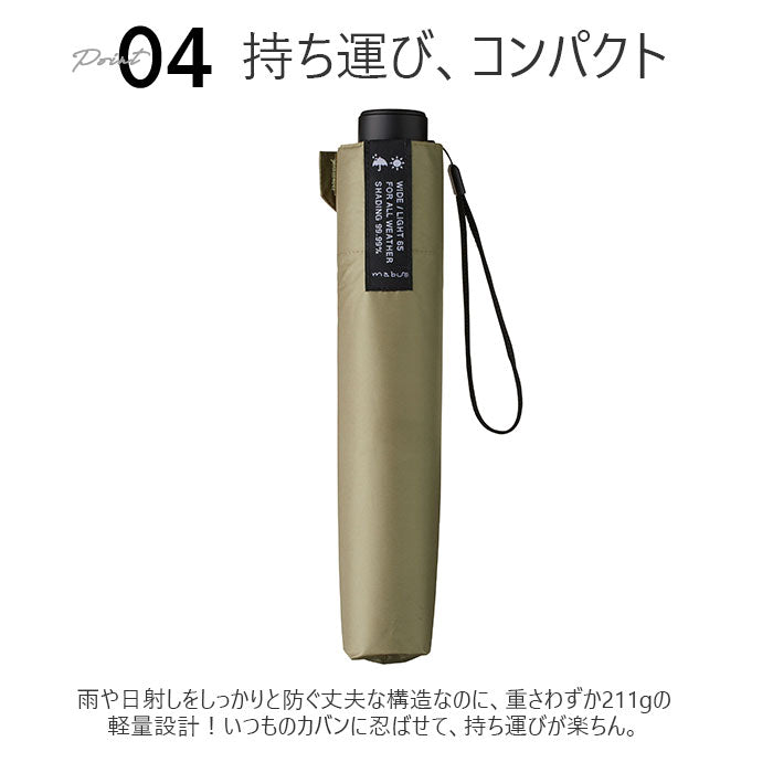 ・雨や日射しをしっかりと防ぐ丈夫な構造なのに、重さわずか230gの軽量設計!いつものカバンに忍ばせて、持ち運びが楽ちん。(※傘袋を含む重量です。)