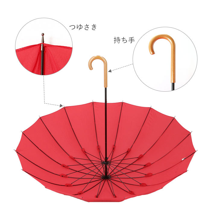 ・親骨に弾力性があり、折れにくいグラスファイバー素材を使用した16本骨仕様。風が少し強めの日でもちゃんとさせて安心。