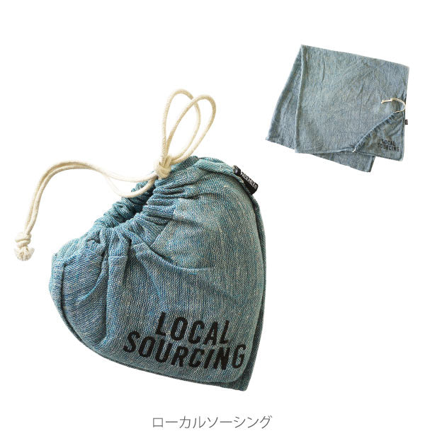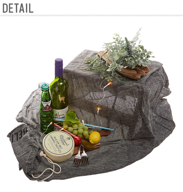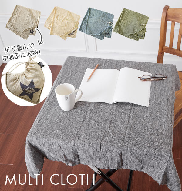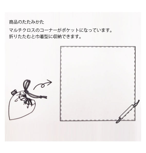 巾着付きのマルチクロスです。テーブルクロスとして、目隠しの布やソファなどのマルチカバーとしても使える布で、持ち運びに便利な巾着が縫い付けてあるため、さっと取り出して使えて袋をなくしません。畳んで端の袋に収めればコンパクトに持ち運べます。