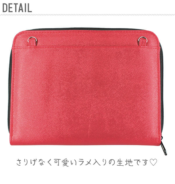 ファスナー開閉タイプで、カード入れ9室、2つのオープンポケット、マジックテープ付きで固定できるファスナーポケットが1つと機能も充実しています。また、取り外し可能なショルダーストラップ付でこのままちょっとしたお出かけもできますね。