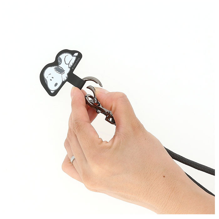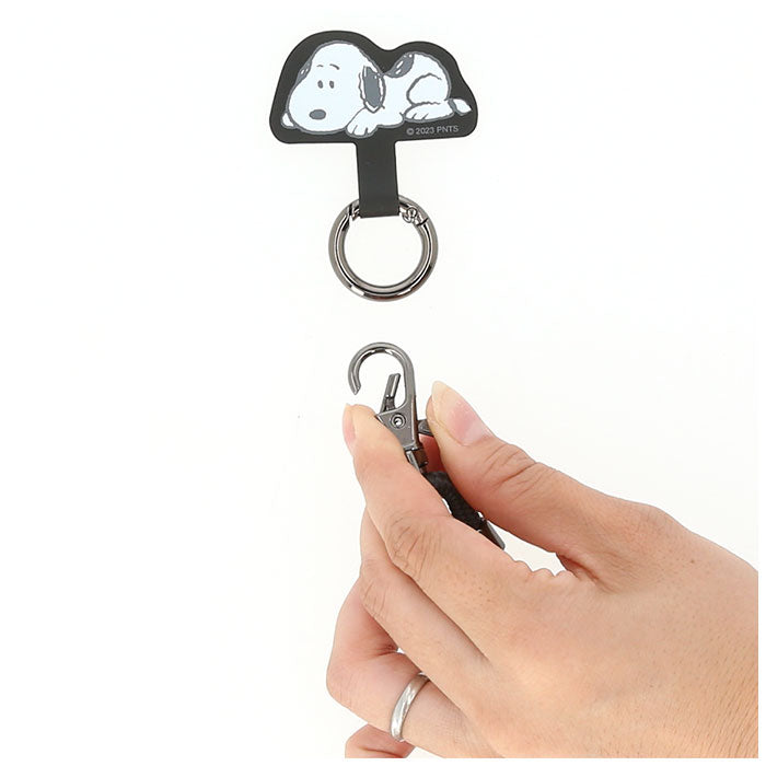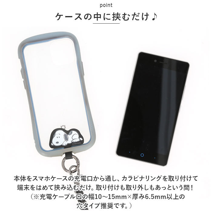 ・本体をスマホケースの充電口から通し、カラビナリングを取り付けて端末をはめて挟み込むだけ。取り付けも取り外しもあっという間!(※充電ケーブル口の幅10~15mm×厚み6.5mm以上の穴タイプ推奨です。)