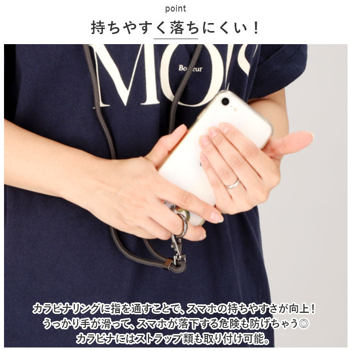・カラビナリングに指を通すことで、スマホの持ちやすさが向上!うっかり手が滑って、スマホが落下する危険も防げちゃう◎カラビナにはストラップ類も取り付け可能。
