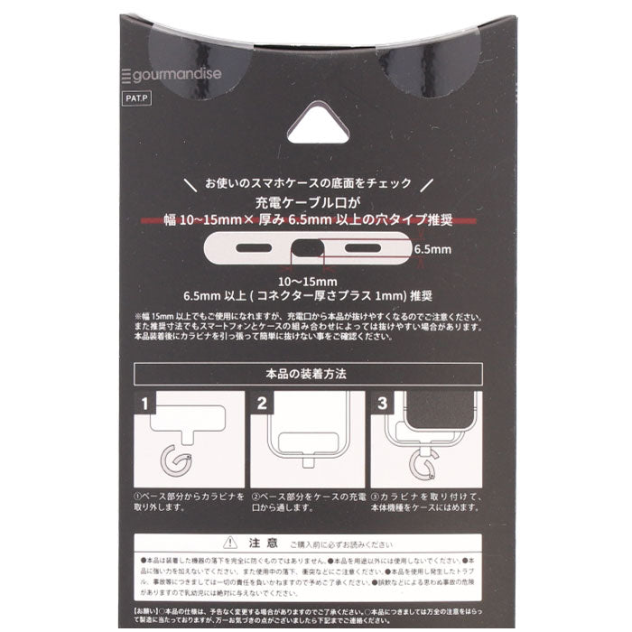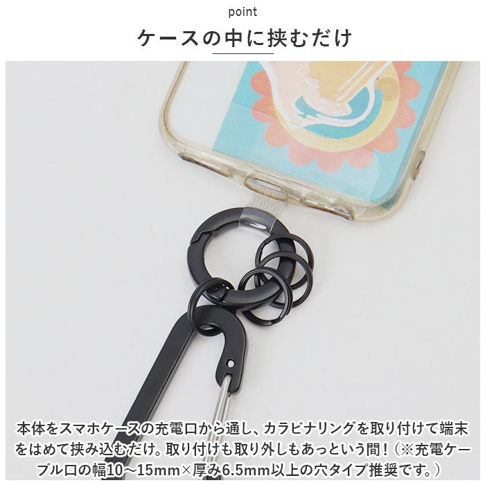 ・本体をスマホケースの充電口から通し、カラビナリングを取り付けて端末をはめて挟み込むだけ。取り付けも取り外しもあっという間!(※充電ケーブル口の幅10~15mm×厚み6.5mm以上の穴タイプ推奨です。)