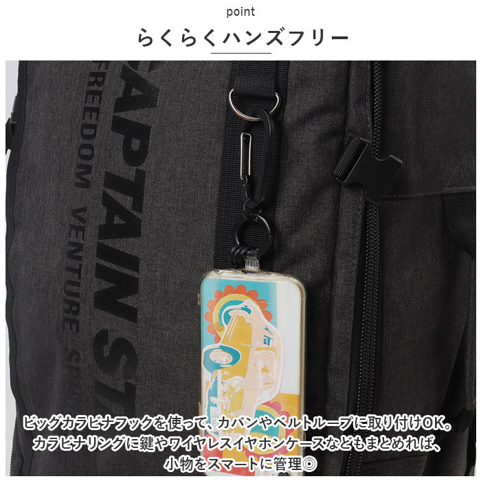 ・ビッグカラビナフックを使って、カバンやベルトループに取り付けOK。カラビナリングに鍵やワイヤレスイヤホンケースなどもまとめれば、小物をスマートに管理◎