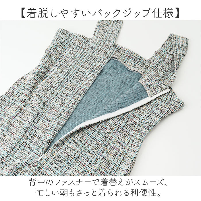 ・背中のファスナーで着替えがスムーズ、忙しい朝もさっと着られる利便性。