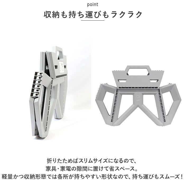 ・折りたためばスリムサイズになるので、家具・家電の隙間に置けて省スペース。軽量かつ収納形態では各所が持ちやすい形状なので、持ち運びもスムーズ!