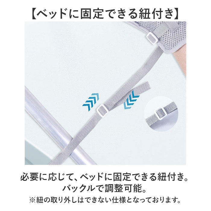 ・必要に応じて、ベッドに固定できる紐付き。バックルで調整可能。※紐の取り外しはできない仕様となっております。