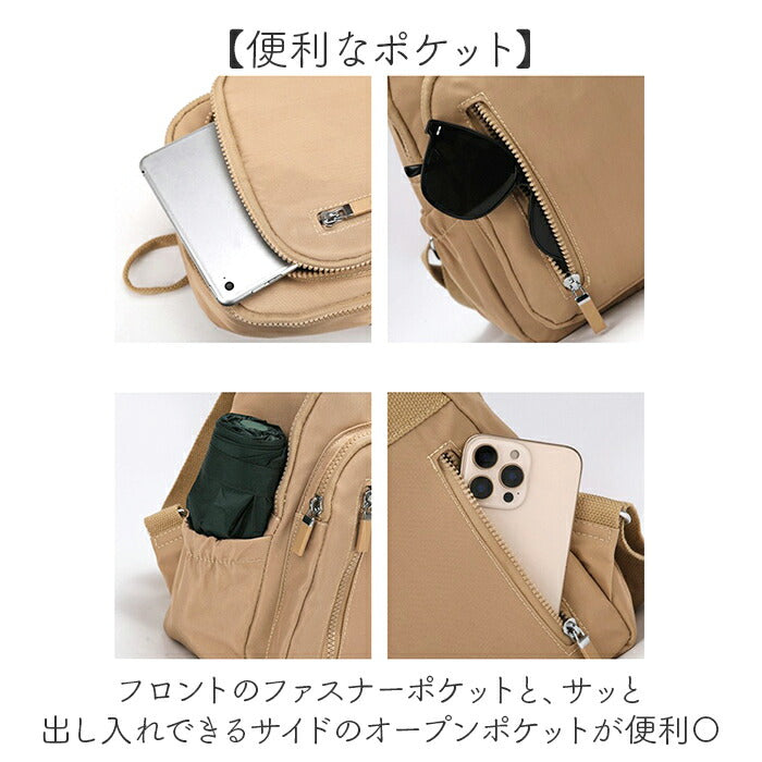 ・フロントのファスナーポケットと、サッと出し入れできるサイドのオープンポケットが便利〇