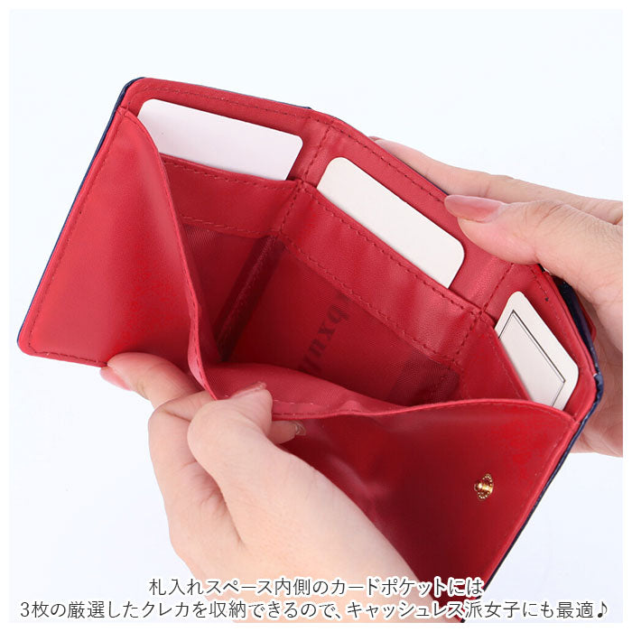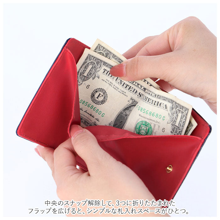 ・手のひらにちょこんと収まるコンパクトサイズに、紙幣やコインやカードがしっかりと収納できる、三つ折りタイプのウォレット。