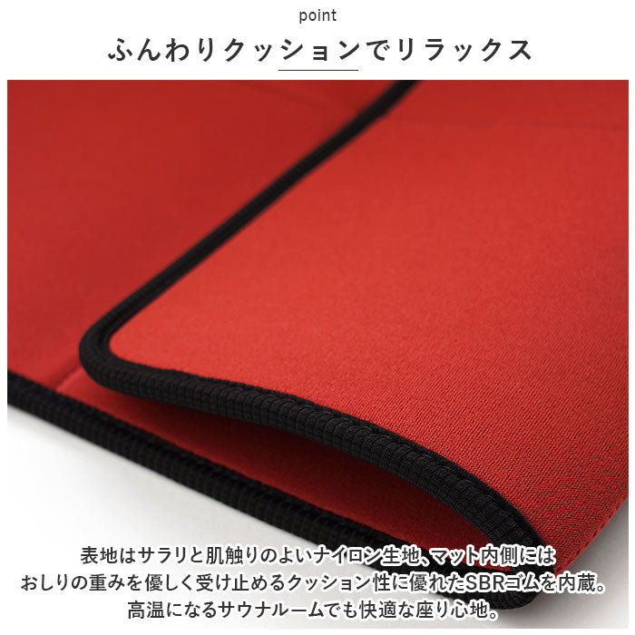 ・表地はサラリと肌触りのよいナイロン生地、マット内側にはおしりの重みを優しく受け止めるクッション性に優れたSBRゴムを内蔵。高温になるサウナルームでも快適な座り心地。