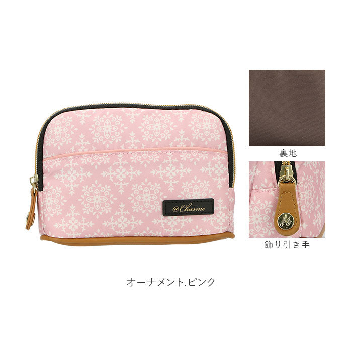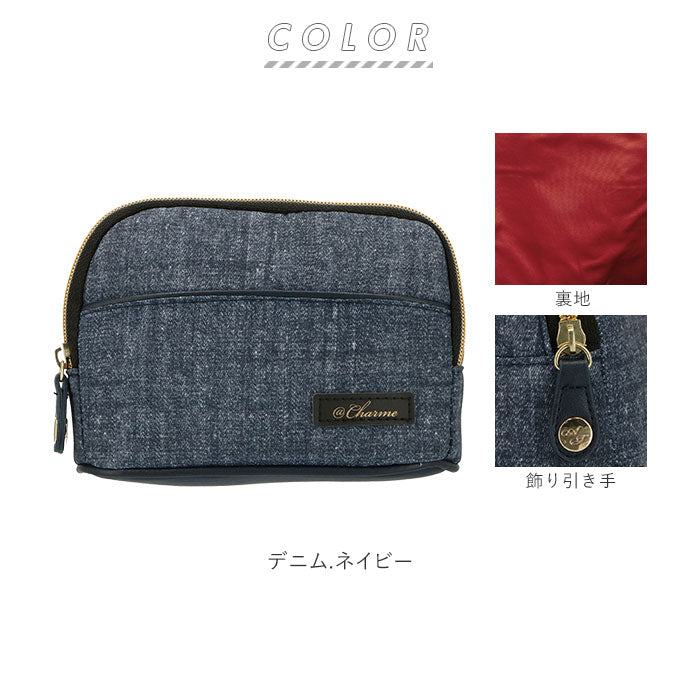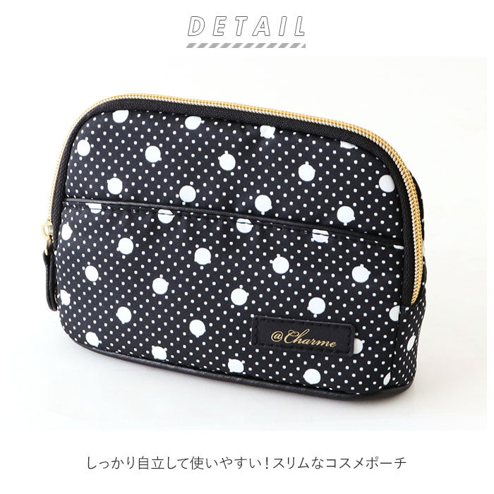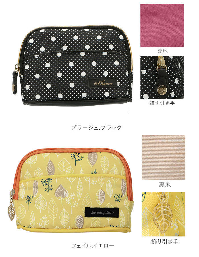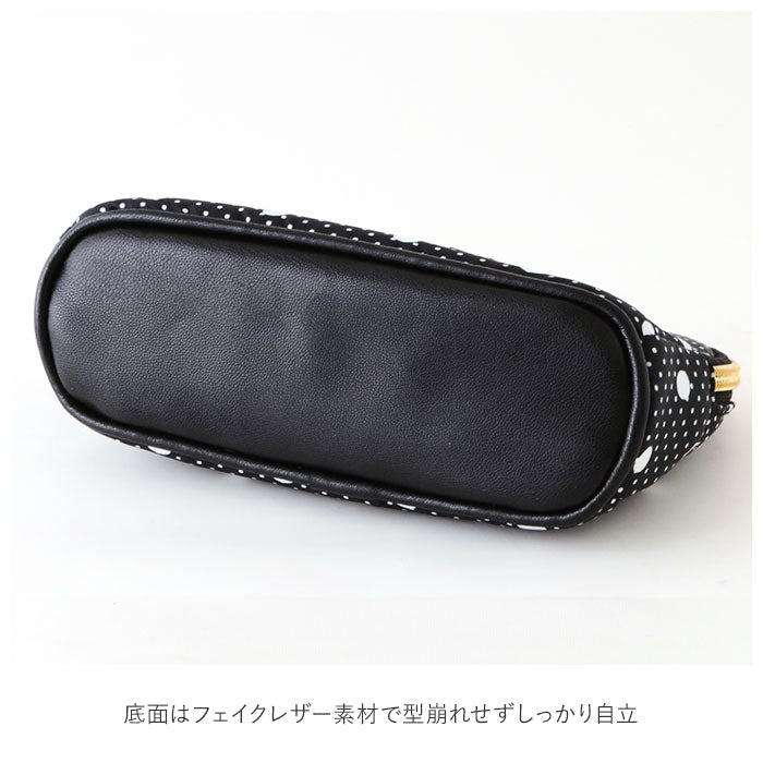 ・底面は本体生地の色味にマッチするフェイクレザー素材を使い、型崩れせずしっかり自立。ドレッサーやパウダールームでもポーチが倒れず、化粧直し手間取らない。