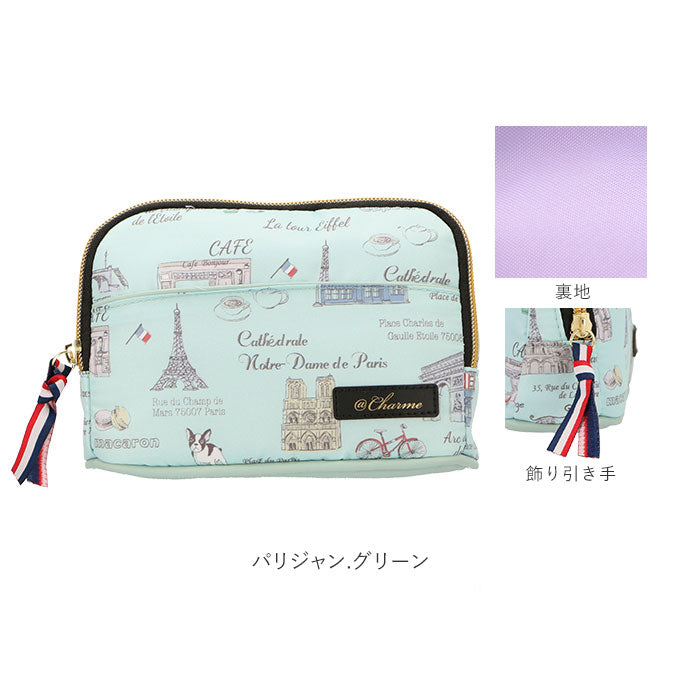 ・ファスナーには、フェイクレザーとトリコロールカラーの飾り引手(※)が付いて、開け閉めしやすい♪ゴールド色のファスナー使いが大人可愛い雰囲気。
