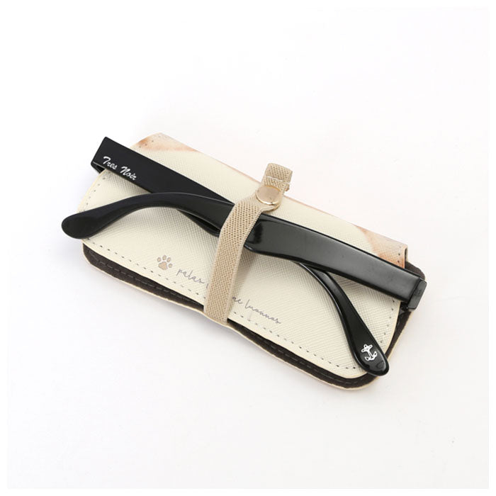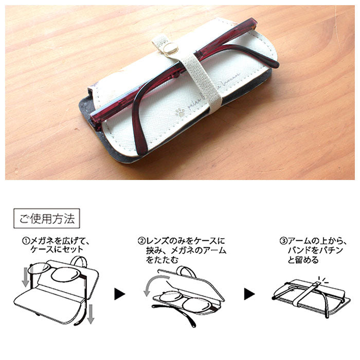 ・メガネのレンズ部分をケースの内側に包み、テンプル(つる)をバンドで留めるユニークなスタイルのメガネケース。