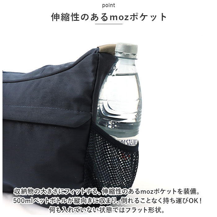 ・収納物の大きさにフィットする、伸縮性のあるmozポケットを装備。500mlペットボトルが縦向きに収まり、倒れることなく持ち運びOK!何も入れていない状態ではフラット形状。