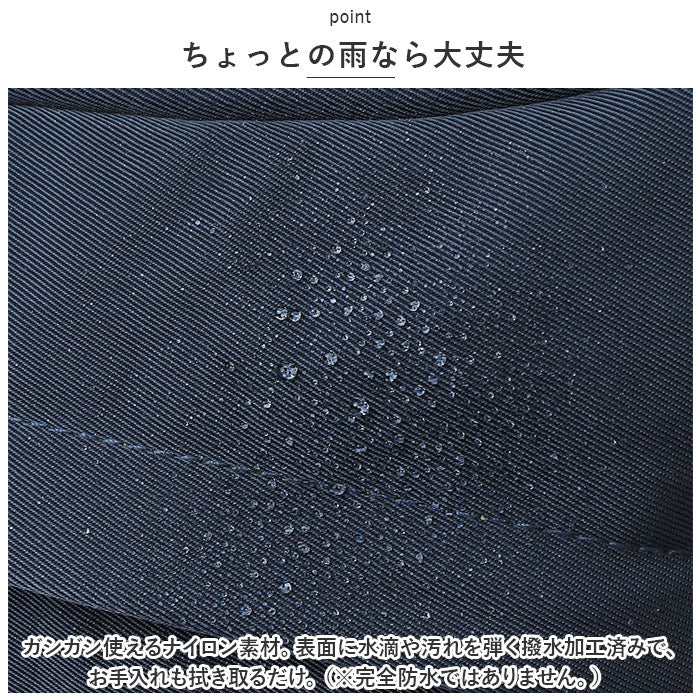・ガシガシ使えるナイロン素材。表面に水滴や汚れを弾く撥水加工済みで、お手入れも拭き取るだけ。(※完全防水ではありません。)