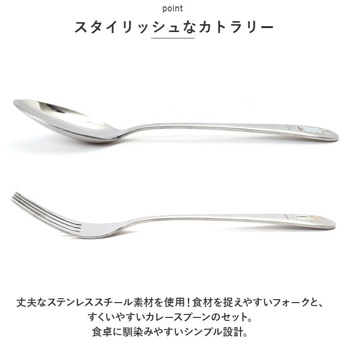 ・丈夫なステンレススチール素材を使用!食材を捉えやすいフォークと、すくいやすいカレースプーンのセット。食卓に馴染みやすいシンプル設計。