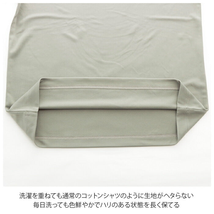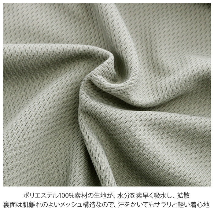 ・ポリエステル100%素材の生地が、水分を素早く吸水し、拡散。裏面は肌離れのよいメッシュ構造なので、汗をかいてもサラリと軽い着心地。