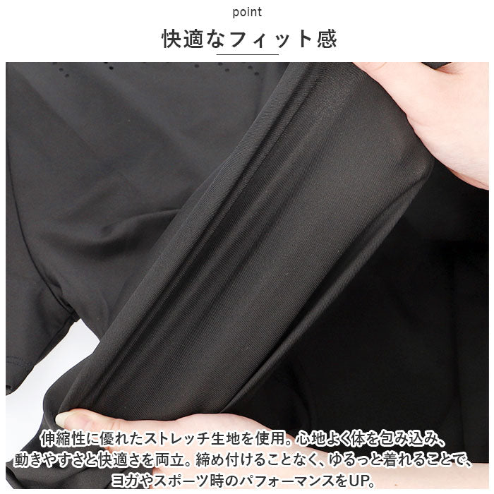 ・伸縮性に優れたストレッチ生地を使用。心地よく体を包み込み、動きやすさと快適さを両立。締め付けることなく、ゆるっと着れることで、ヨガやスポーツ時のパフォーマンスをUP。