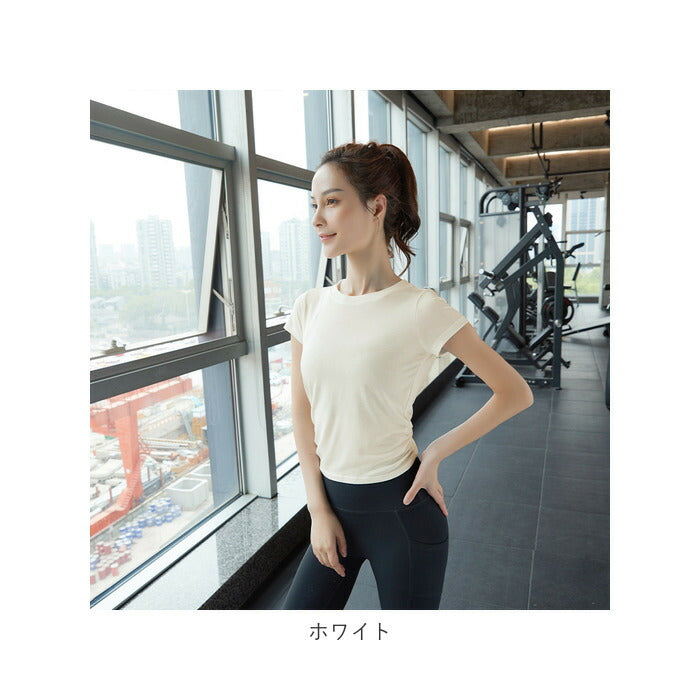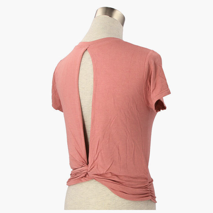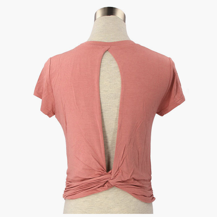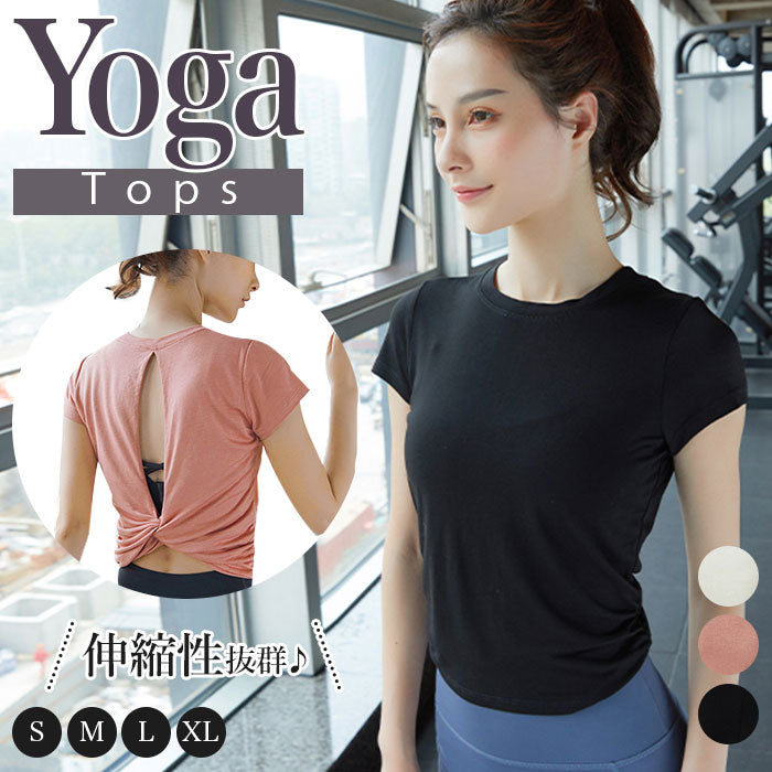 ヨガウェア トップス 半袖 通販 レディース おしゃれ 丈短め ツイストデザイン 背中開き 背中あき 伸縮性 ストレッチ Sサイズ Mサイズ Lサイズ XLサイズ ブラック ホワイト ピンク