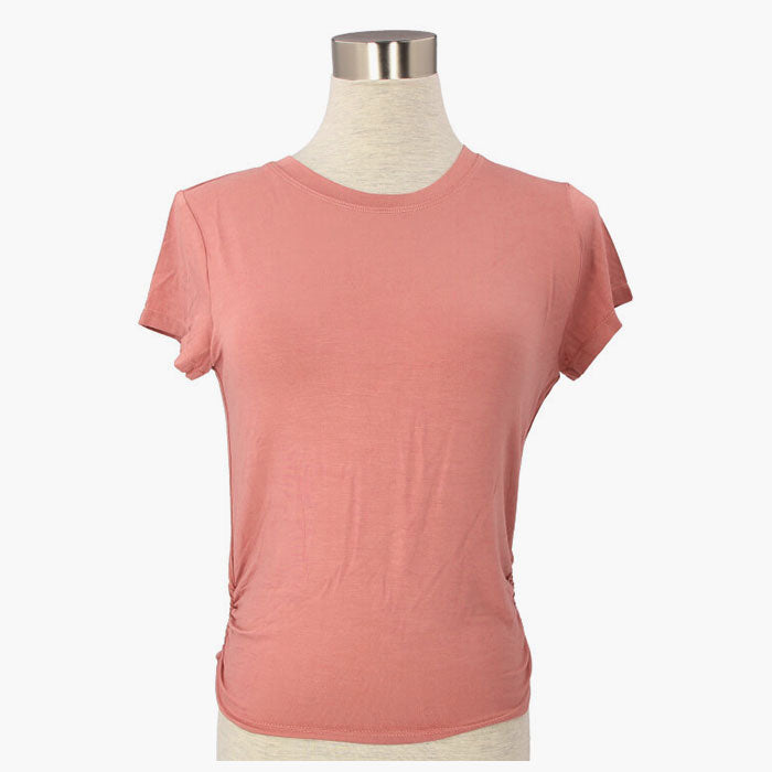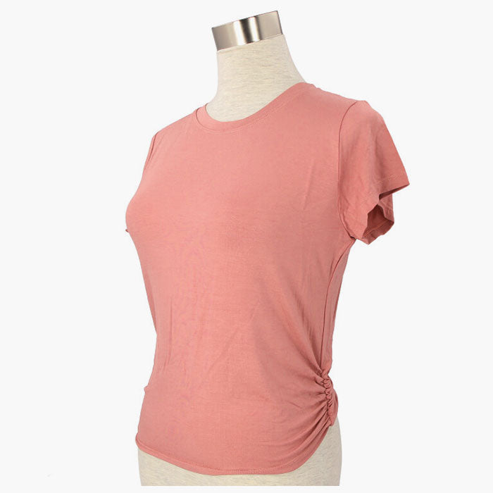 ・シンプルで着こなしやすい、半袖タイプのトップス。胸元が見えにくい、浅めのクルーネックタイプ。