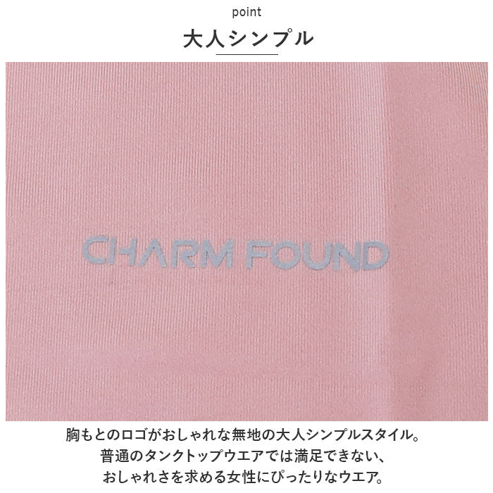 ・胸もとのロゴがおしゃれな無地の大人シンプルスタイル。普通のタンクトップウエアでは満足できない、おしゃれさを求める女性にぴったりなウエア。
