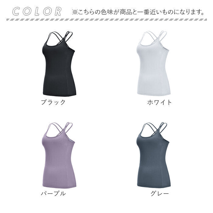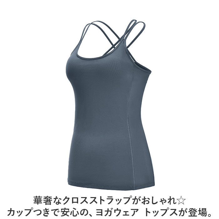 ・華奢なクロスストラップがおしゃれ☆カップつきで安心の、ヨガウェア トップスが登場。