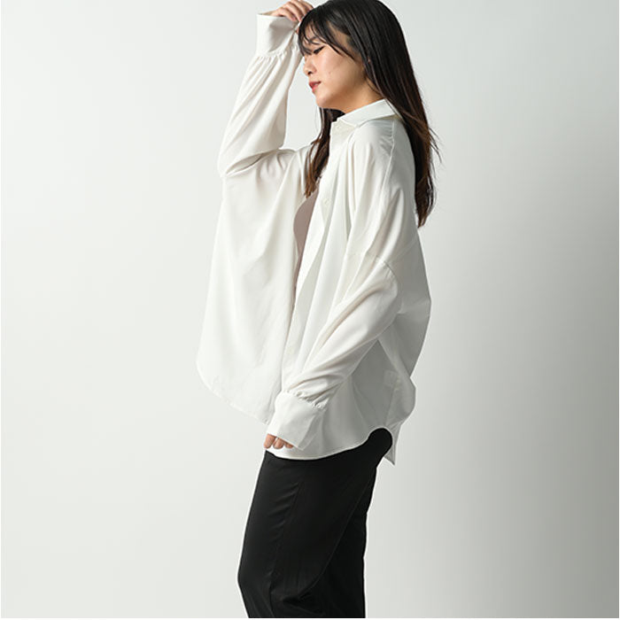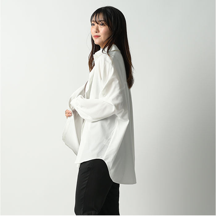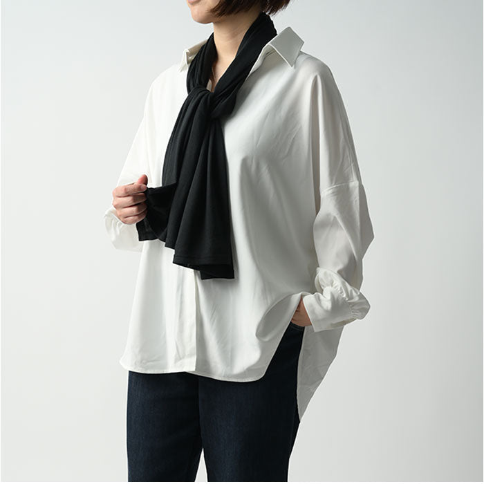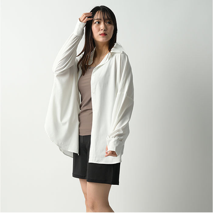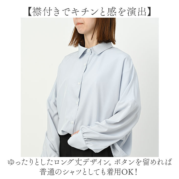 ・ゆったりとしたロング丈デザイン。ボタンを留めれば普通のシャツとしても着用OK!