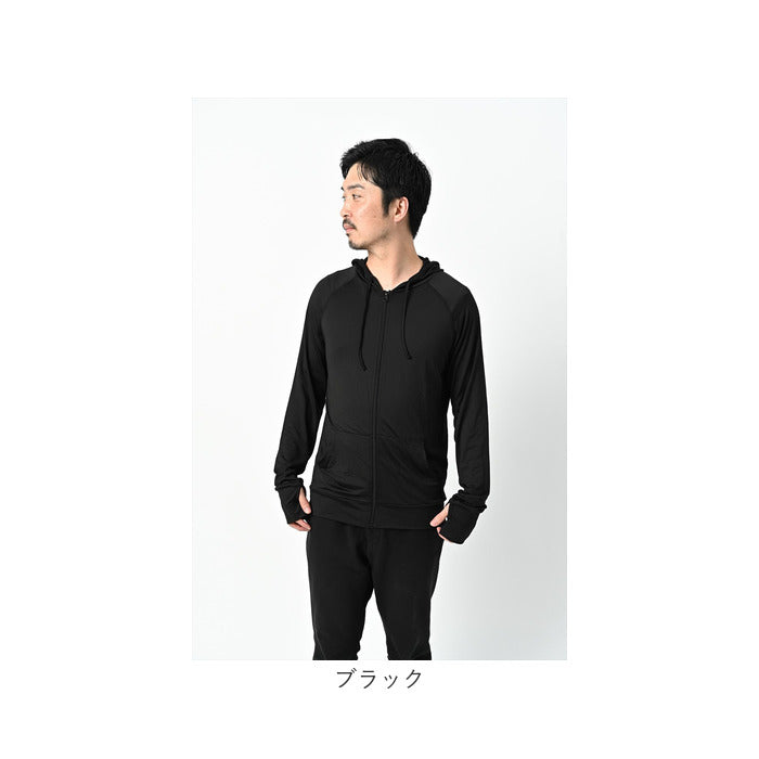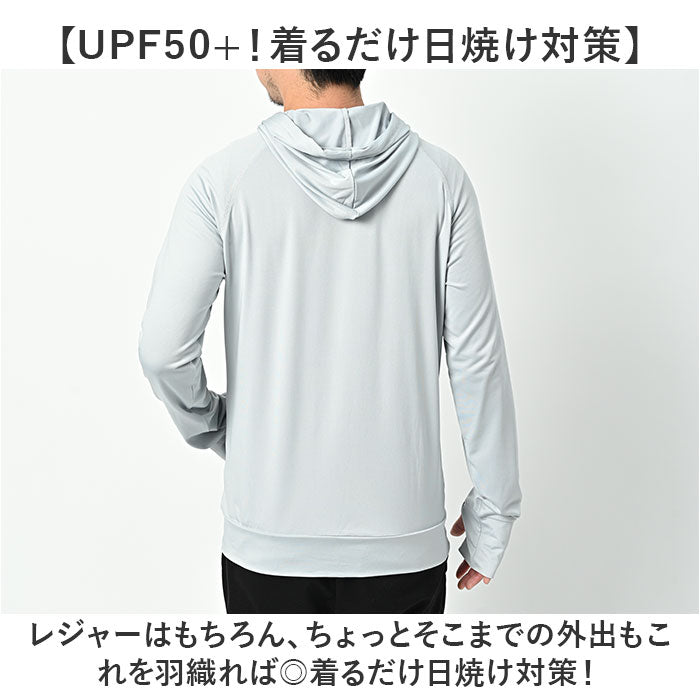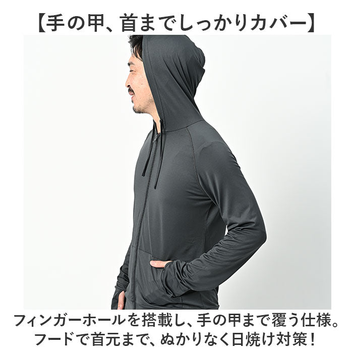 ・フィンガーホールを搭載し、手の甲まで覆う仕様。フードで首元まで、ぬかりなく日焼け対策!
