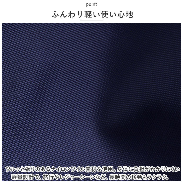 ・ツルッと張りのあるナイロンツイル素材を使用。身体に負担がかかりにくい軽量設計で、旅行やレジャーシーンなど、長時間の移動もラクラク。