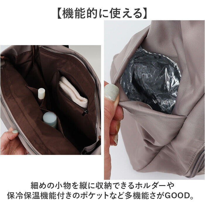 ・細めの小物を縦に収納できるホルダーや保冷保温機能付きのポケットなど多機能さがGOOD。