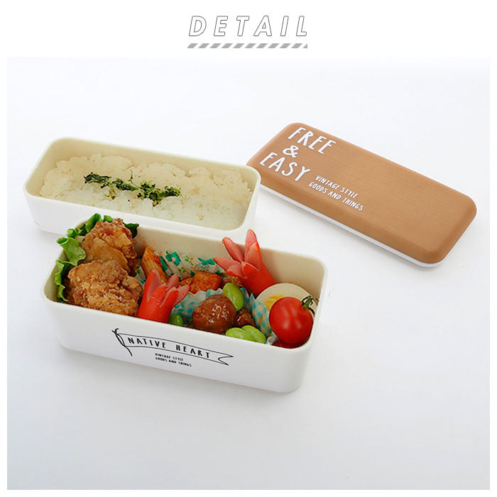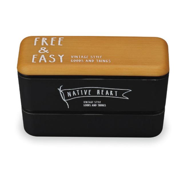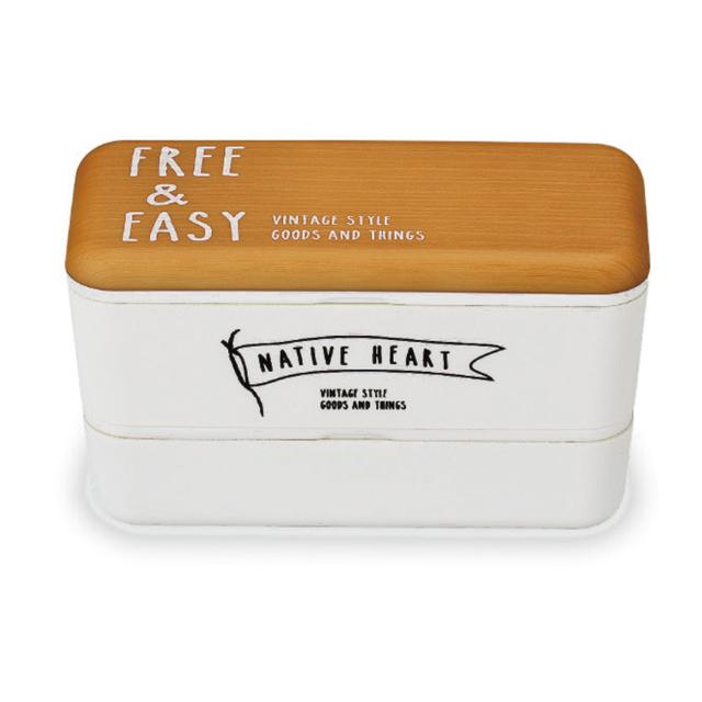 ・木目の上蓋がナチュラルで手書き風の文字がかわいい長角二段ランチボックス。