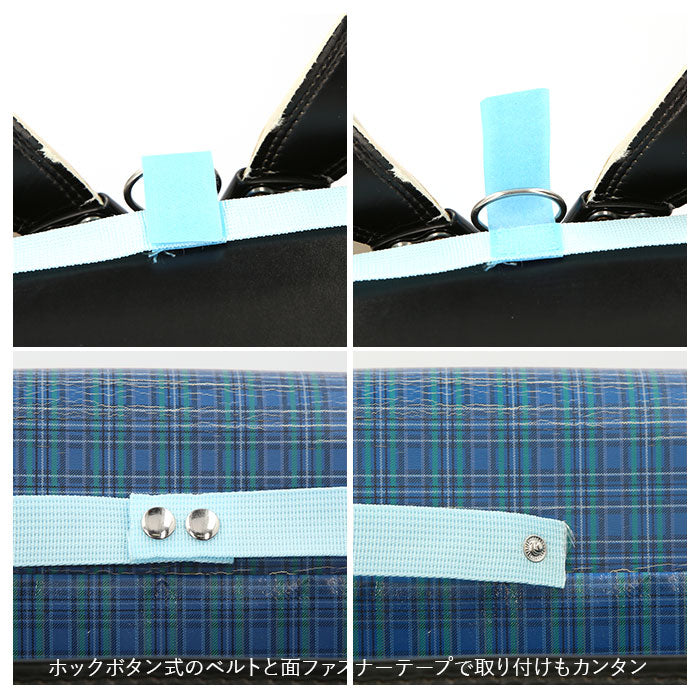 ・ホックボタン式のベルトと面ファスナーテープで取り付けもカンタン。ベルトはランドセルの背面やカブセ内側に隠れるため、見た目もすっきり。