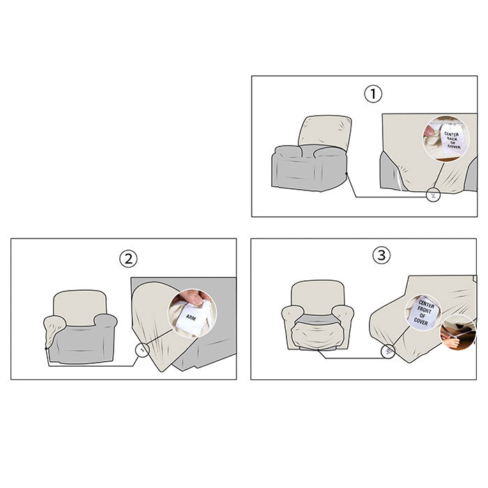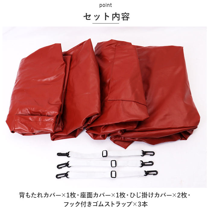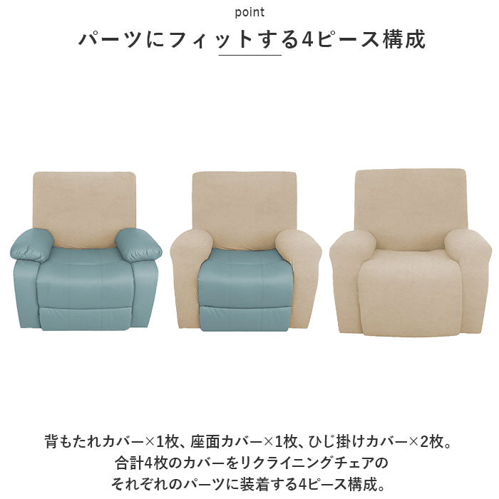 ・背もたれカバー×1枚、座面カバー×1枚、ひじ掛けカバー×2枚。合計4枚のカバーをリクライニングチェアのそれぞれのパーツに装着する4ピース構成。