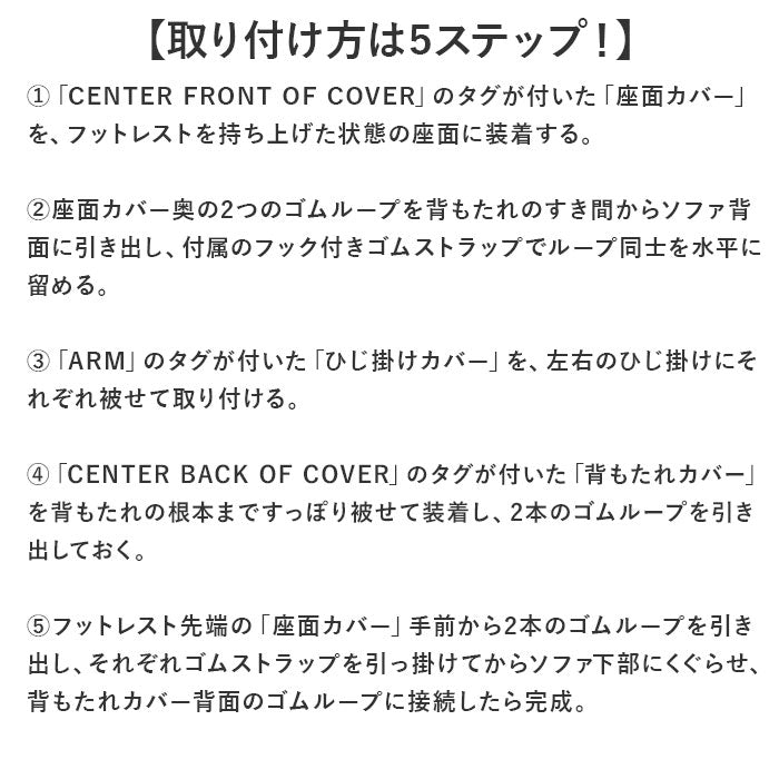 5.フットレスト先端の「座面カバー」手前から2本のゴムループを引き出し、それぞれゴムストラップを引っ掛けてからソファ下部にくぐらせ、背もたれカバー背面のゴムループに接続したら完成。